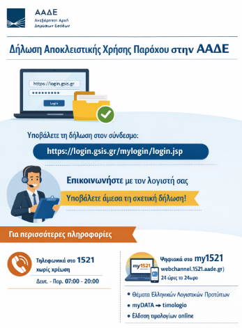 Ενημέρωση σχετικά με τη δήλωση αποκλειστικής χρήσης Παρόχου στην ΑΑΔΕ